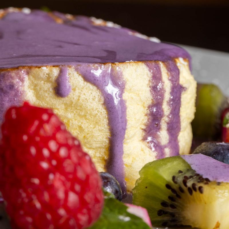 3 pancakes soaked in sweet tres leches milk and a caramel drizzle, then topped with whipped cream, fresh peaches and strawberries.