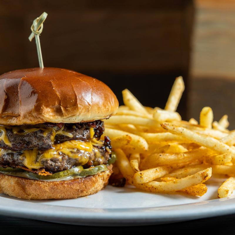 Two fresh Australian Wagyu patties with pickles, cheddar cheese, topped with our special bacon jam and zesty BBQ mayo spread on a brioche bun.