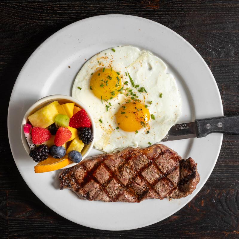Grilled flat iron steak with two eggs any style. Served with your choice of side and toast.