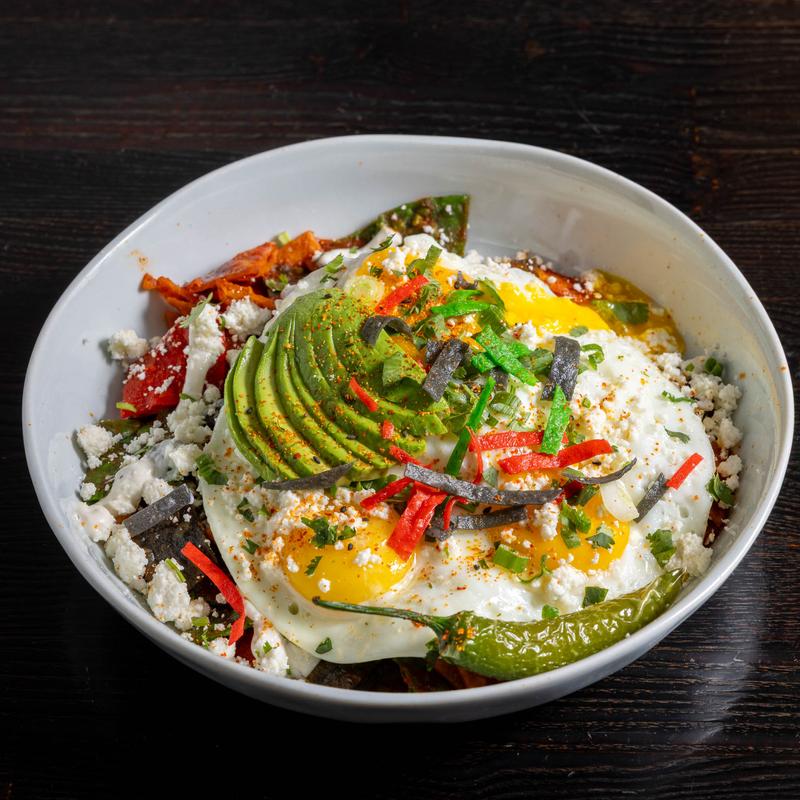 Tortilla chips tossed in sautéed onions and homemade enchilada sauce. Topped with three sunny side up eggs, queso fresco, green onions, creme fraiche and an avocado garnish.
